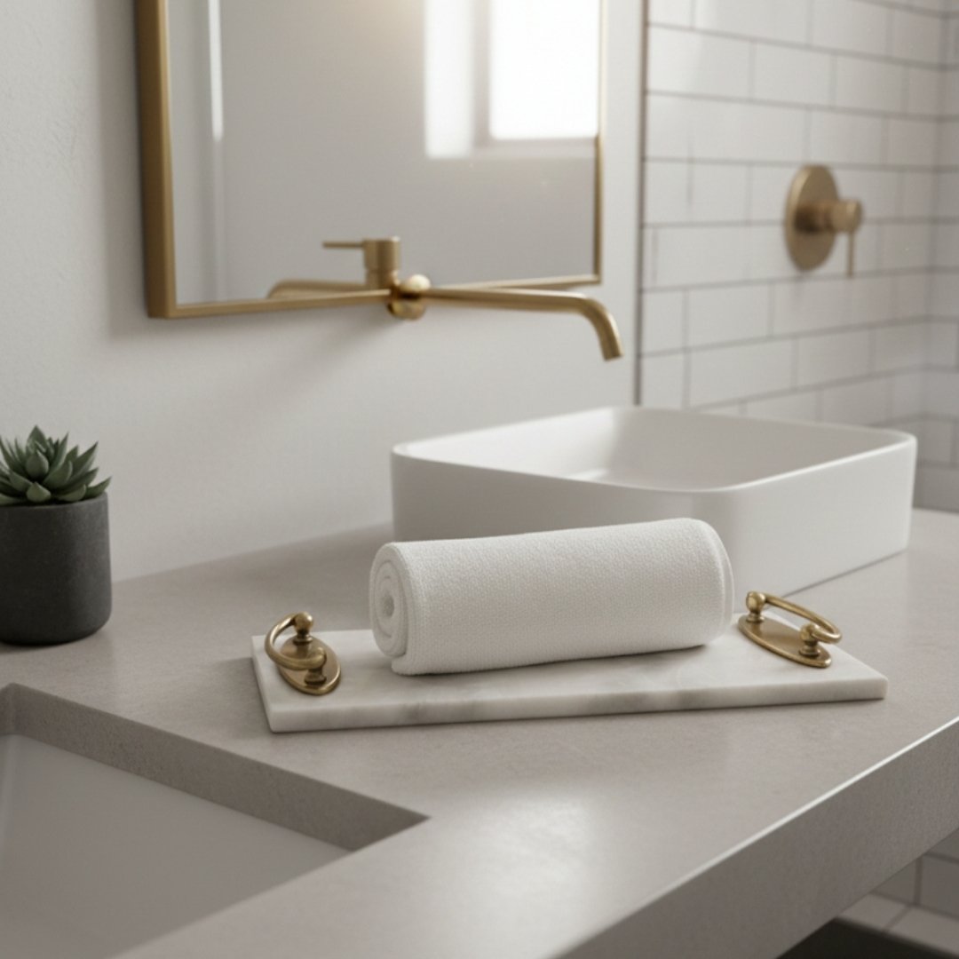 Add a touch of elegance and functionality to your bathroom or kitchen with this stylish towel hook tray. Featuring a sleek white base complemented by golden hooks, it combines modern design with practical use. Measuring 12″ x 5″ x 0.5″ and weighing 950 g, it is sturdy enough to hold towels, keys, or small accessories while enhancing the decor of your space. A perfect blend of style and convenience.